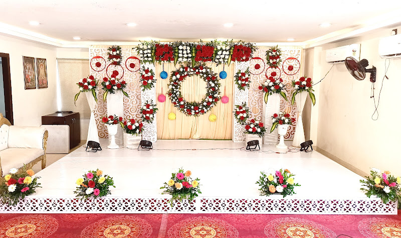 Listing Category: VenuesListing Tags: chair covers, crystal chandelier, dessert counter, floral mandap, reception event, round stage, round tables, stage carpet, stage lighting, sweet shop corner, traditional band, valet service, video shooting, and welcome drinks